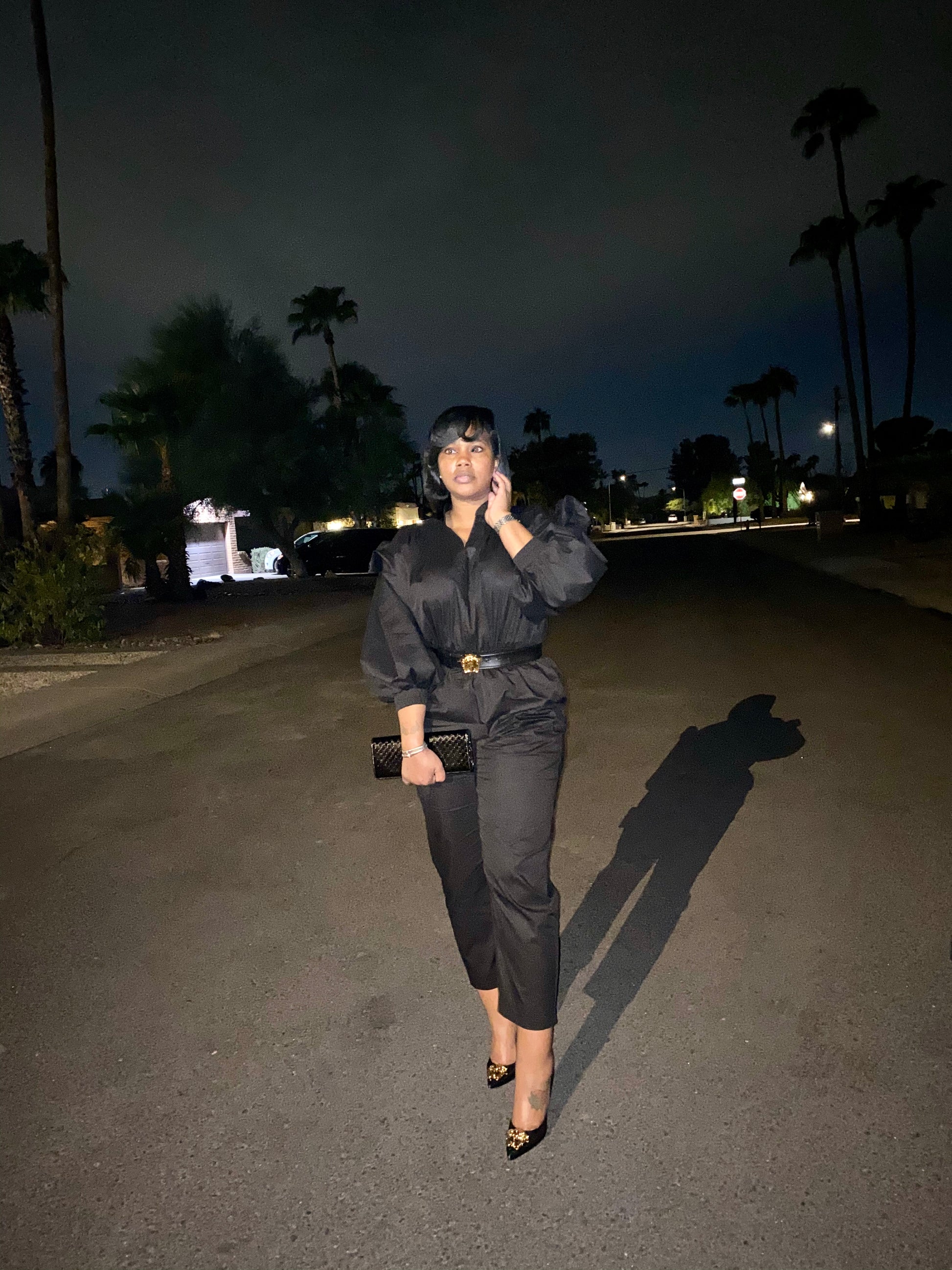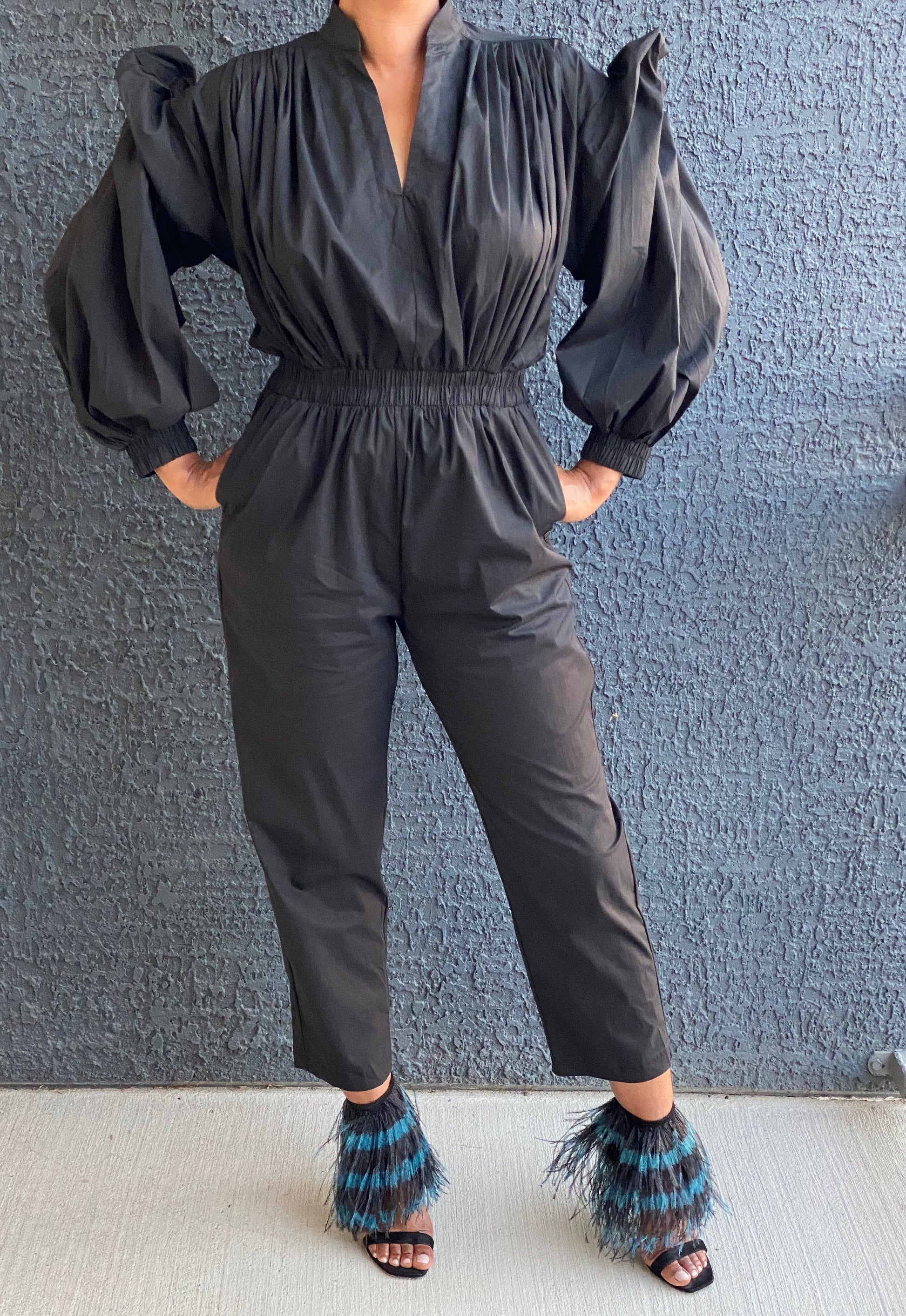 Dress it up. Dress it down! The Alana Jumpsuit has puffy sleeves, a zipped closure in the back, an elastic waistband, and tapered hem. Pair it with a pair of pumps or a comfy sneaker to complete the look. 65% cotton 30% nylon 5% spandex
