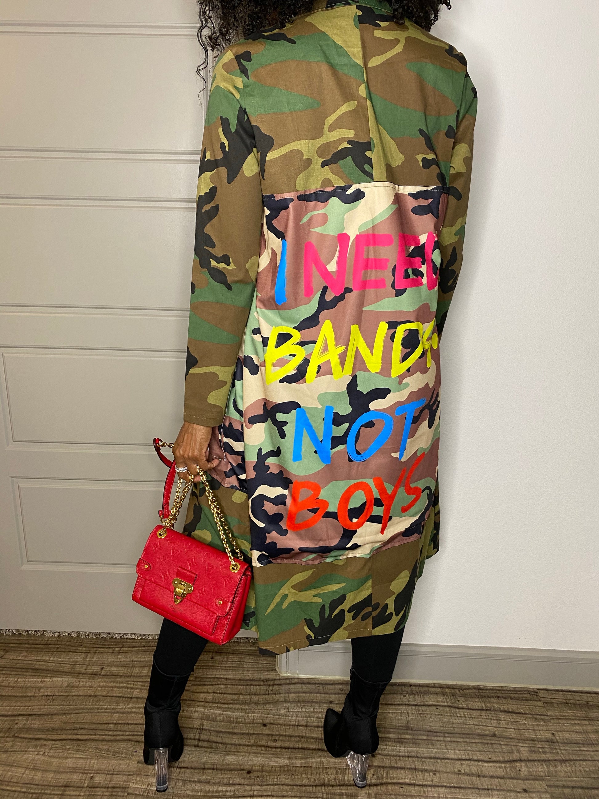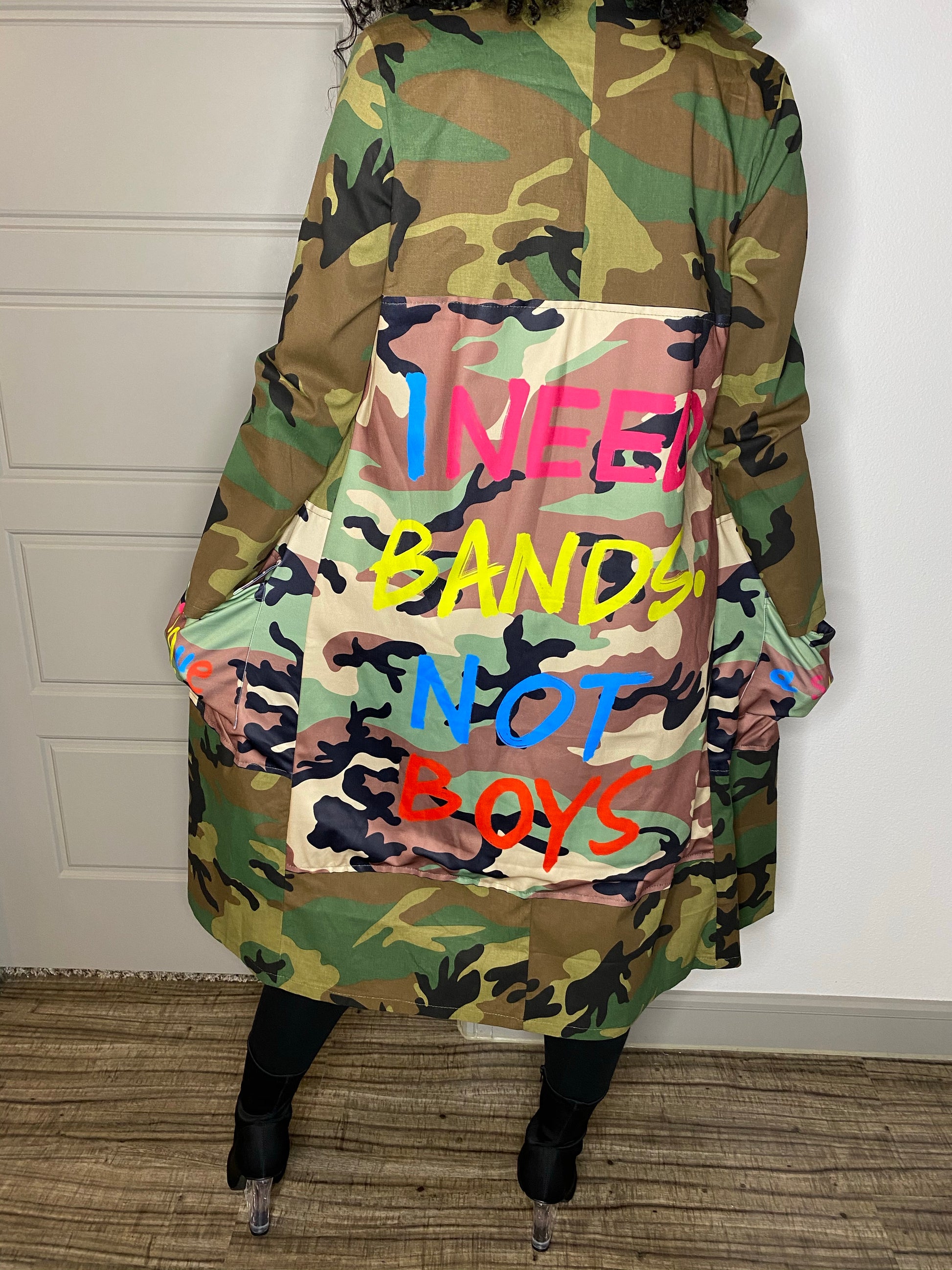 This camouflage jacket is all about making a statement! Going even further with the words "I Need Bands Not Boys" printed on the back in bright colors. Open front, side pockets, extended length. Unlined. RUNS SMALL