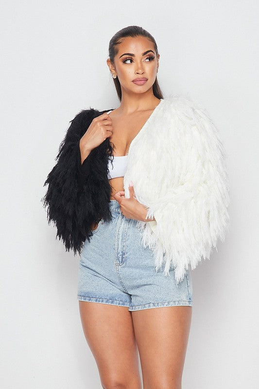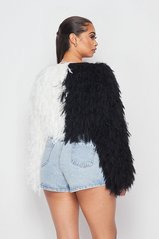 Split color black and white fuzzy cardigan. Has one hook closure in the front. 50% acrylic, 30% polyester, 20% nylon