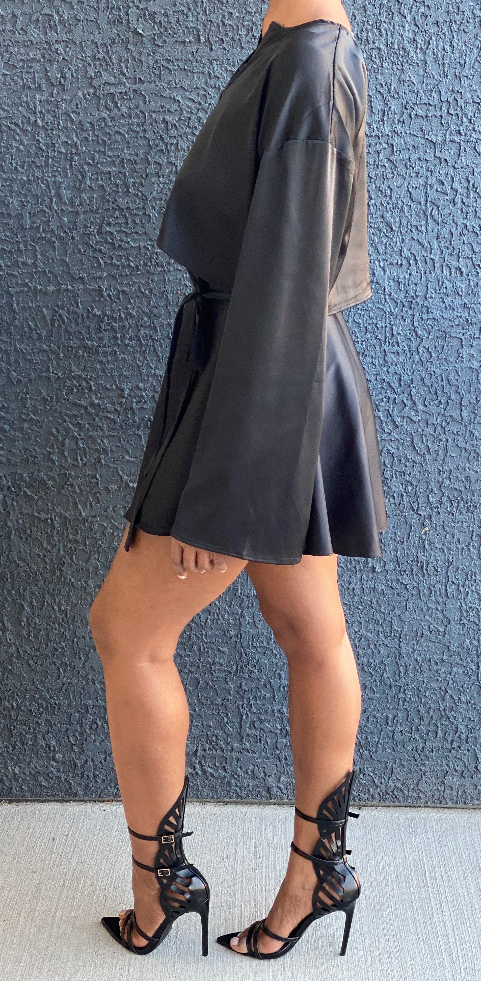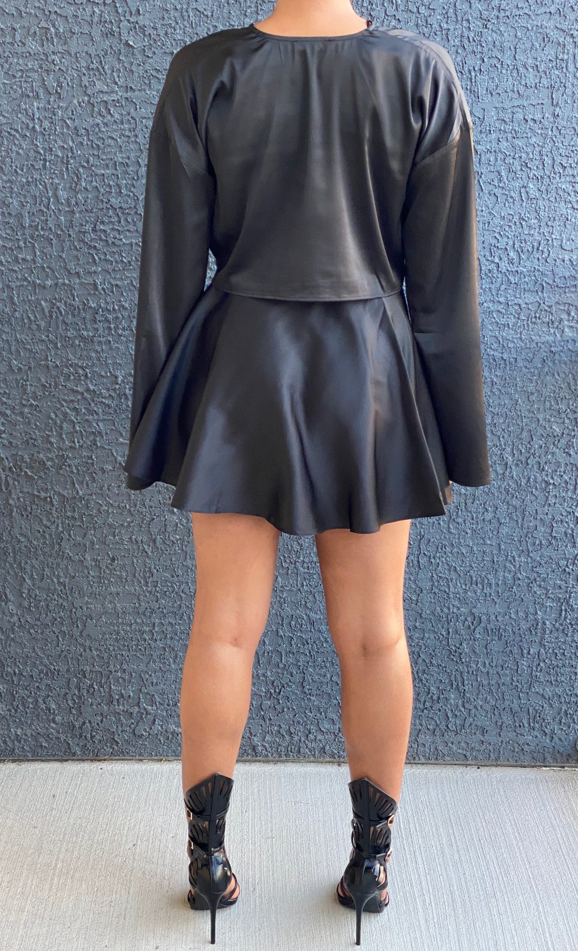 This über cute satin feel skirt set can AND SHOULD also be worn as separates! The top has bell sleeves and the skirt is a wrap skirt. Ultra luxe satin material. 100% polyester