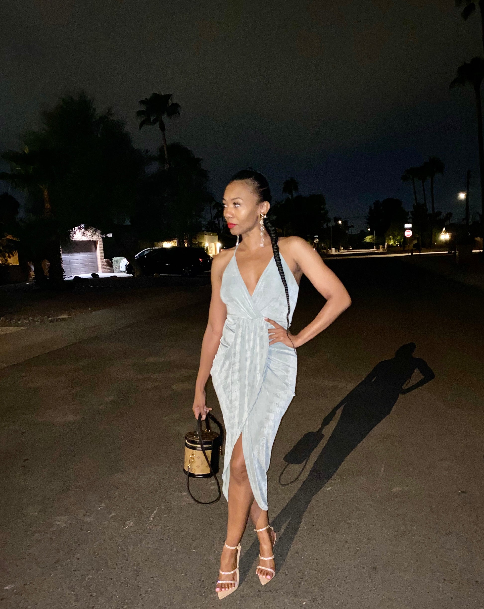 The "Faith" faux wrap dress is great for dinner or a date night. It has spaghetti straps, and a shorter skirt underneath with a faux wrap draping. Dusty mint color. 95% polyester 5 % spandex