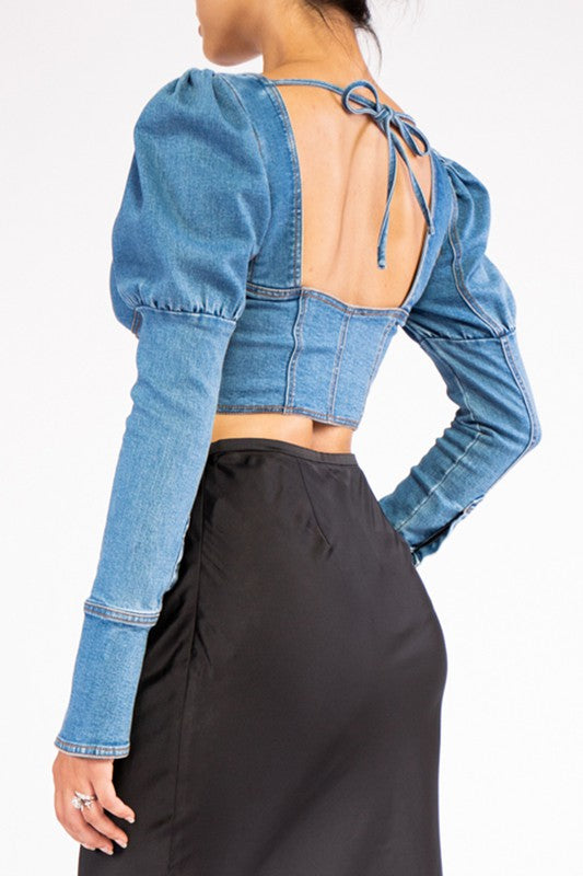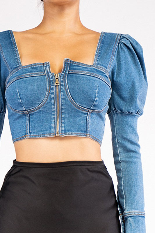 It's all in the details and we love a good puff sleeve! Denim, long sleeved, banded, bustier cropped top with a zippered front and tie back. 70% cotton, 28% polyester, 2% spandex