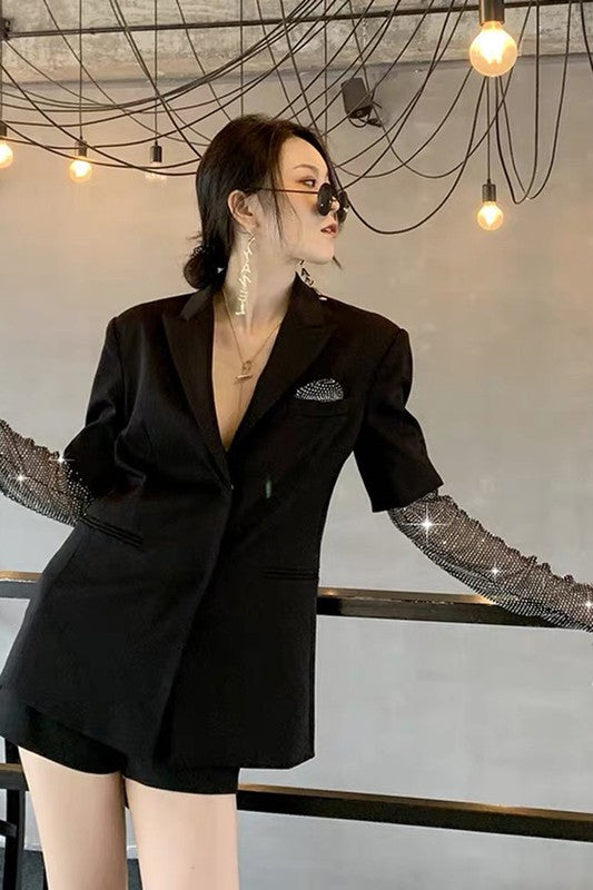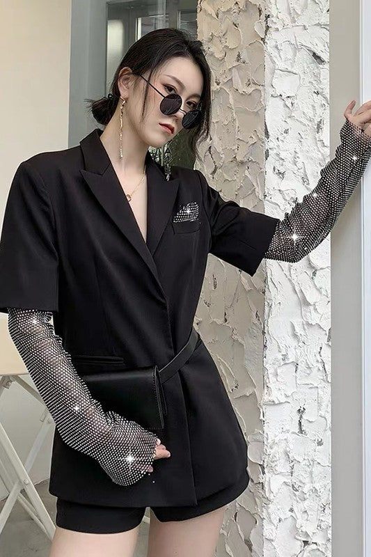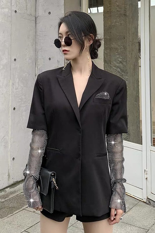 This rhinestone blazer features rhinestone sleeves and a rhinestone handkerchief. 100% polyester. *small size measures 27.25" in length, 16.5" shoulder, 16.5" bust, 26" sleeves*