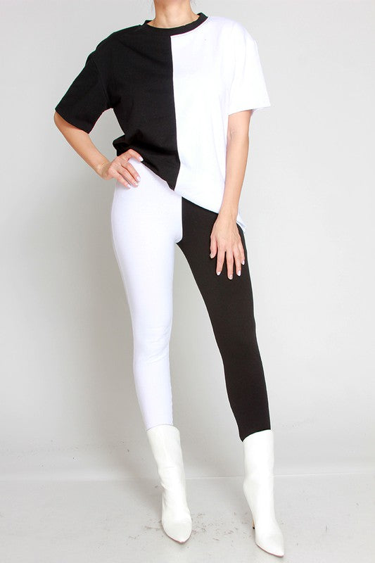 This black/white lounge set can be worn on a casual trip to the mall or to brunch with the girls! Top is a relaxed fit with spandex leggings.