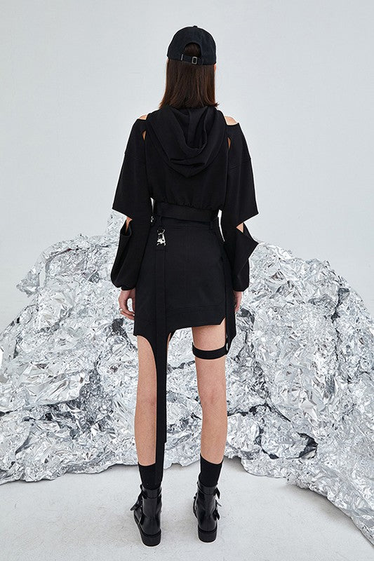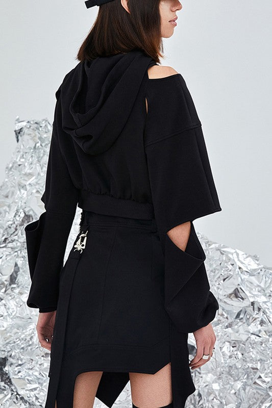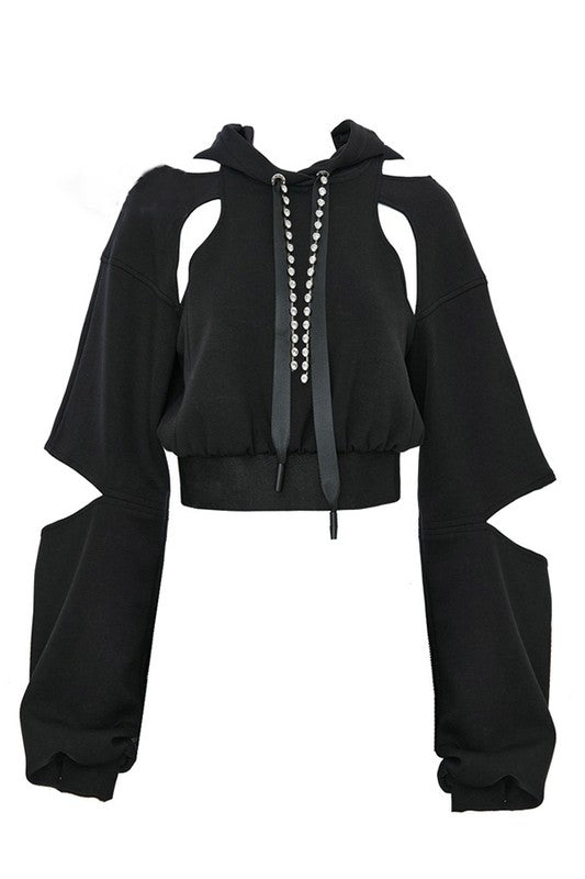 Long sleeved, hollow out hoodie with rhinestone chain and ribbon hoodie pulls. Elastic waistband. 100% cotton. *small size- 43.75" bust, 20" length, 20.25" sleeves*