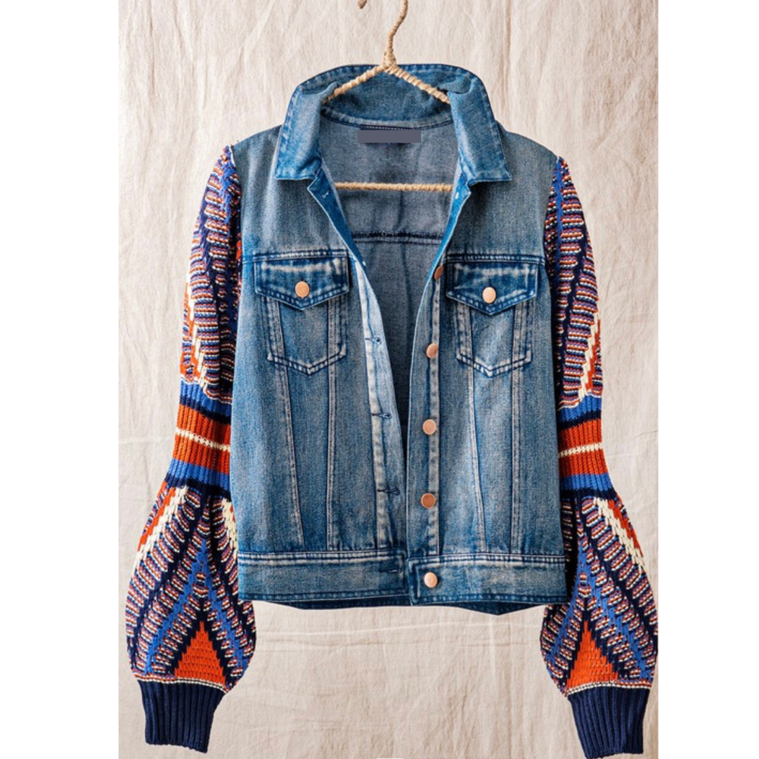Pattern knit sleeve button down denim jacket. Pairs great as a denim on denim look or with a cute skirt. 100% cotton