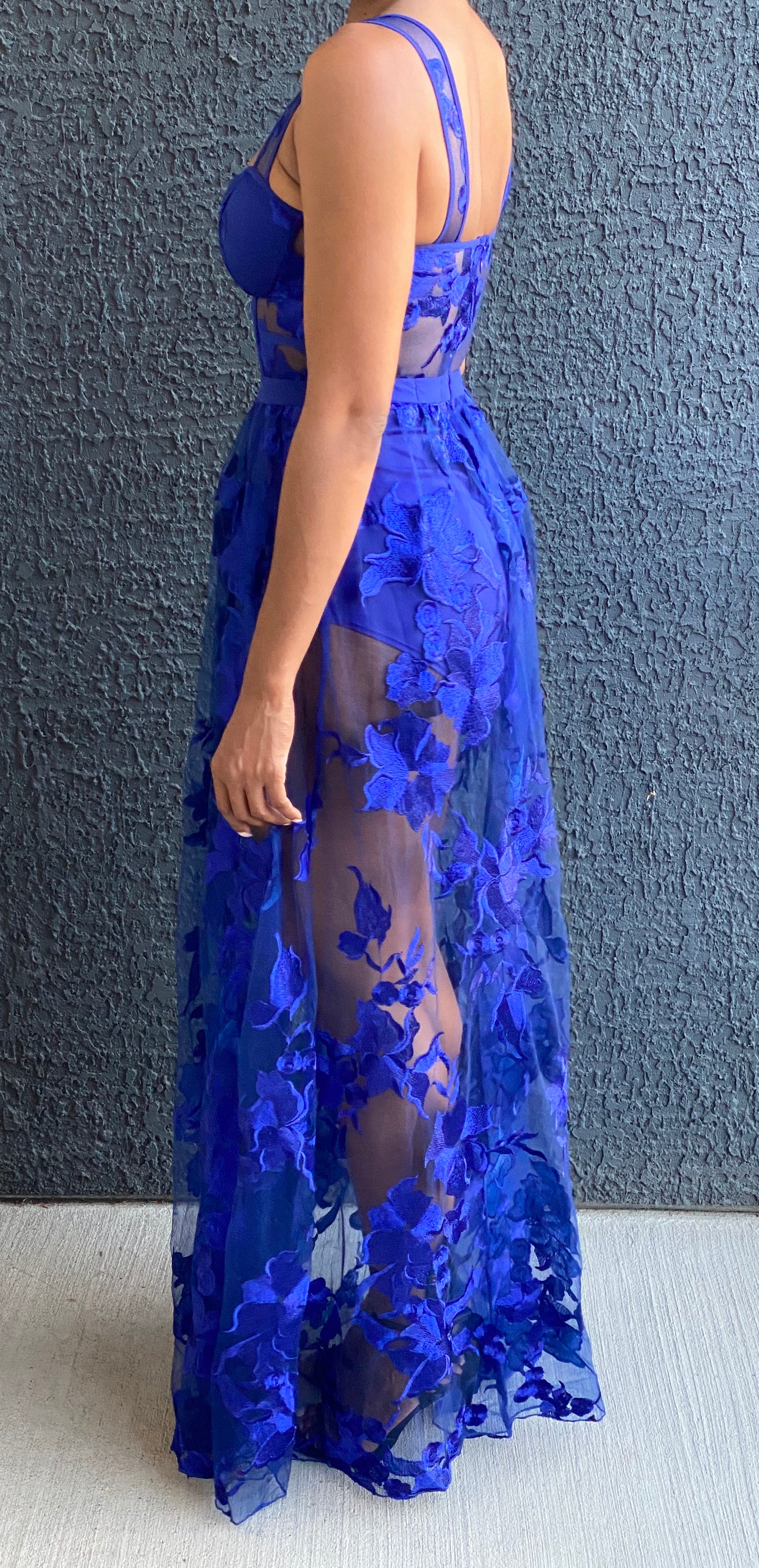 This floor sweeping dress is a head turner! The blue is SO vibrant! Has a zipper closure in the back and attached hot shorts.