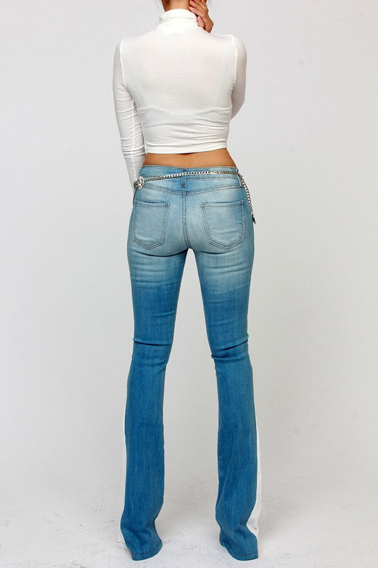 Basic denim where? Not here! You'll need a cropped top (or a bodysuit) and bomb handbag to complete this look. Side color blocked jeans with back pockets and zipped closure. Chain belt shown in photo is not included.