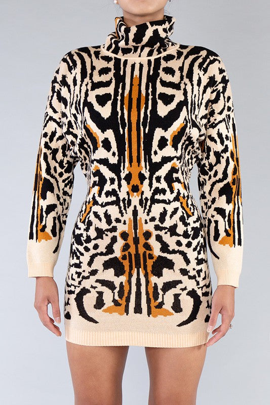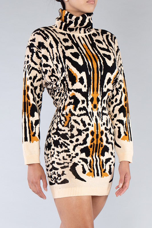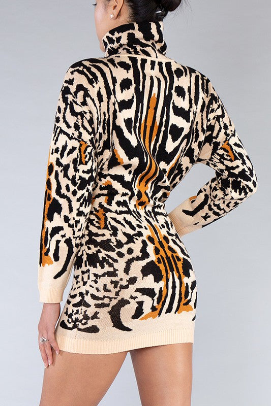 Tiger print, high neck, mini, sweater dress feels amazing on the body. Soft and stretchy, it would be great paired with a pair of over the knee, cognac colored boots!