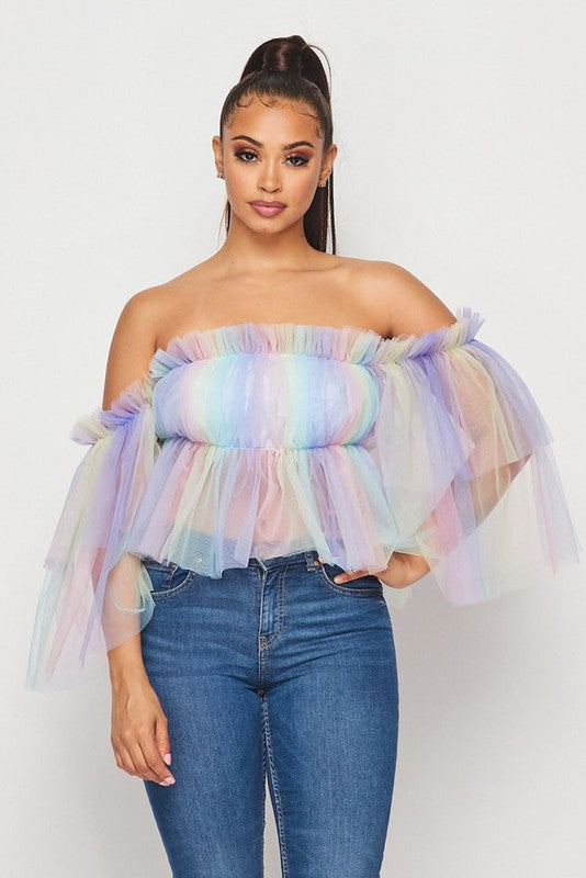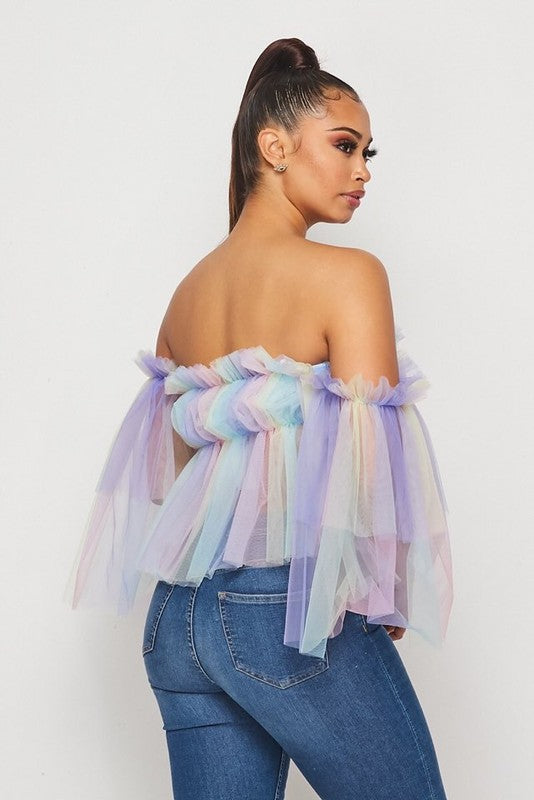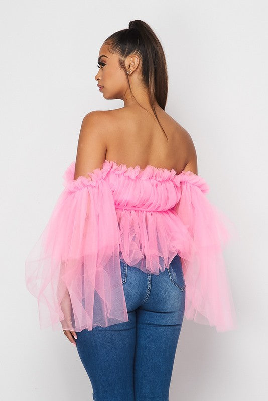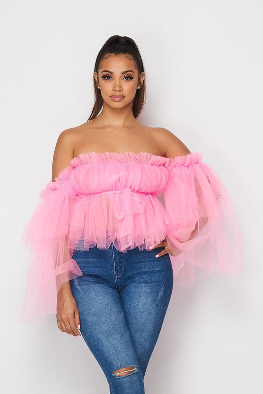 Can we say ADORABLE! This off the shoulder, tulle, pastel-colored top is so fitting for a girl's night out, party, or date night! Pair it with a pair of high waisted jeans and get ready to paint the town pink...or purple...or yellow! Also available in solid pink.